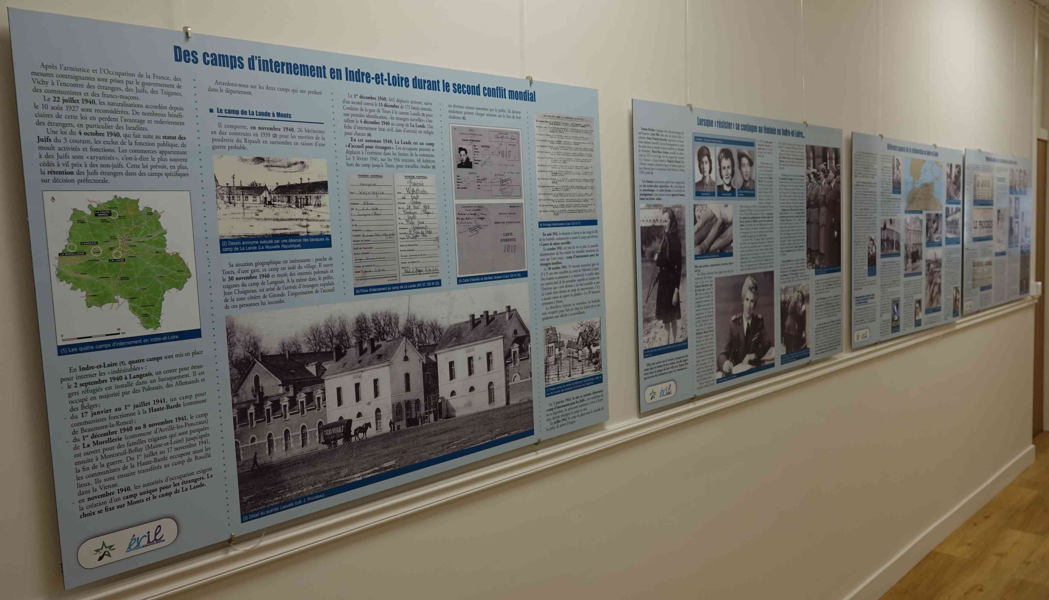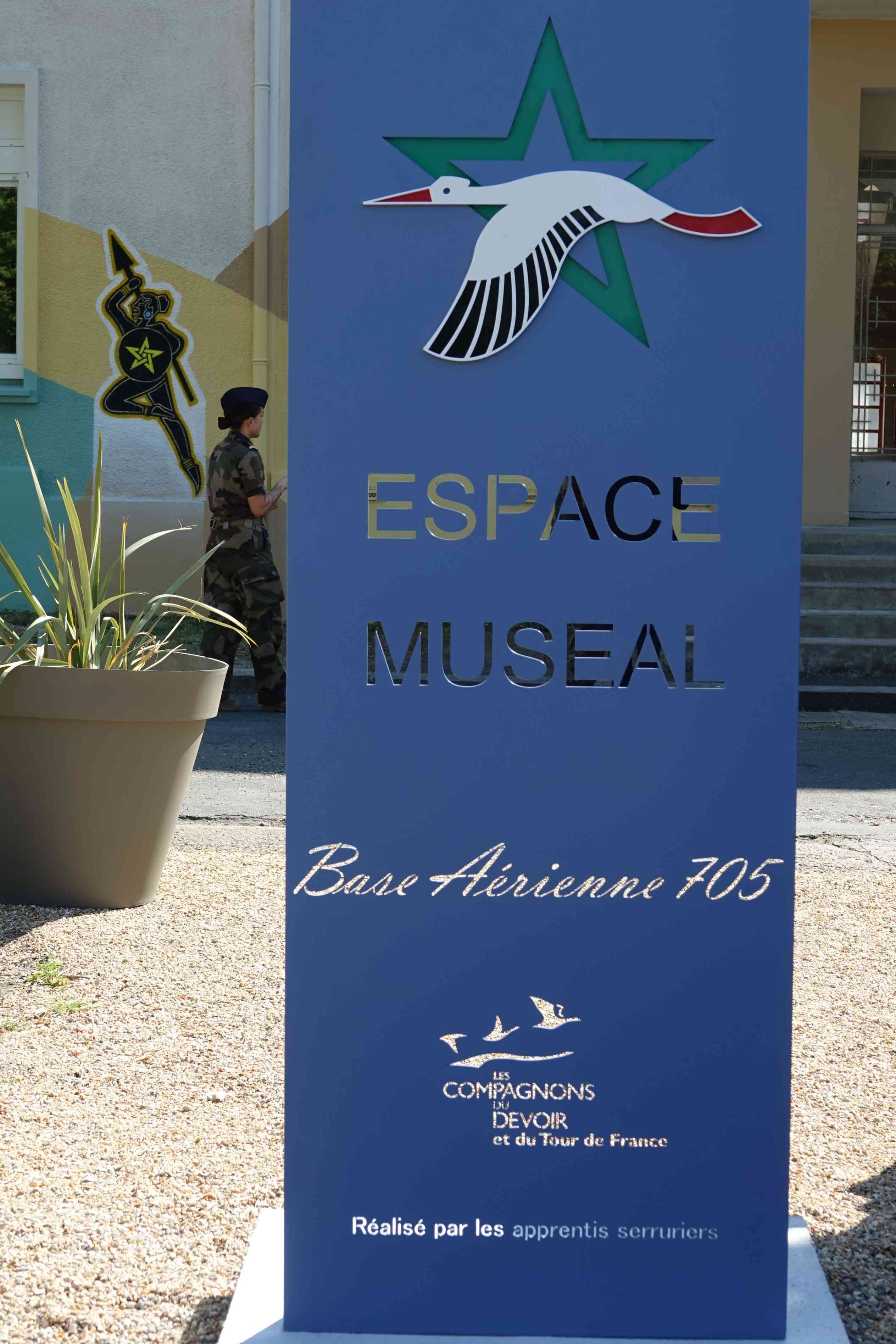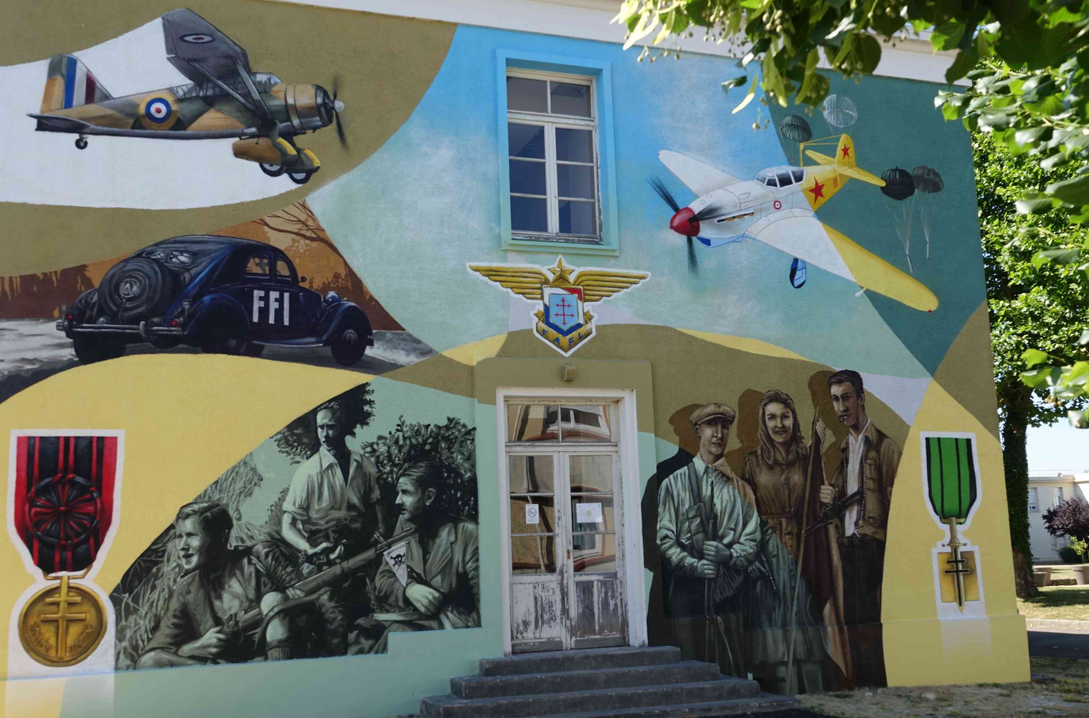membre du comité scientifique pour la partie Résistance. Les panneaux ont été mis en place les 5, 12 et 16 juin par Chantal Ciret, Bernard Petit, Didier Rocque et Daniel Teillay. L'espace muséal comprend pour le moment : deux pièces aménagées comportant des objets, des drapeaux, des documents papier, des mannequins illustrant la Seconde Guerre mondiale et l'Armée de l'Air depuis 1945. Deux panneaux narrant la vie du Commandant Tulasne qui a donné son nom à la BA 705, réalisés par Chantal Ciret, figurent dans une de ces pièces. Tulasne a rejoint les Forces françaises aériennes libres au Moyen- Orient puis a participé à une des escadrilles baptisées Normandie-Niemen. Il a été abattu à Orel en URSS en 1943 et fait Compagnon de la Libération. Un drapeau FFI d'époque donné par l'ÉRIl et deux répliques de poteaux de la ligne de démarcation venant de l'association HMVC ornent aussi cette pièce. Le couloir faisant toute la longueur du bâtiment est recouvert des deux côtés par les 41 panneaux réalisés par Chantal Ciret sur l'histoire de la Touraine de 1939 à 1945. Ces panneaux d'1,20m sur 0,80m couvrent l'Occupation, la Résistance, la collaboration, la Libération, les exactions, l'épuration... Une douzaine de documents originaux mis sous cadre complètent cette exposition bien structurée donc convenant à un musée. Une fresque orne, à l'extérieur, le bâtiment. Elle met en relief l'Armée de l'Air et la Résistance. |