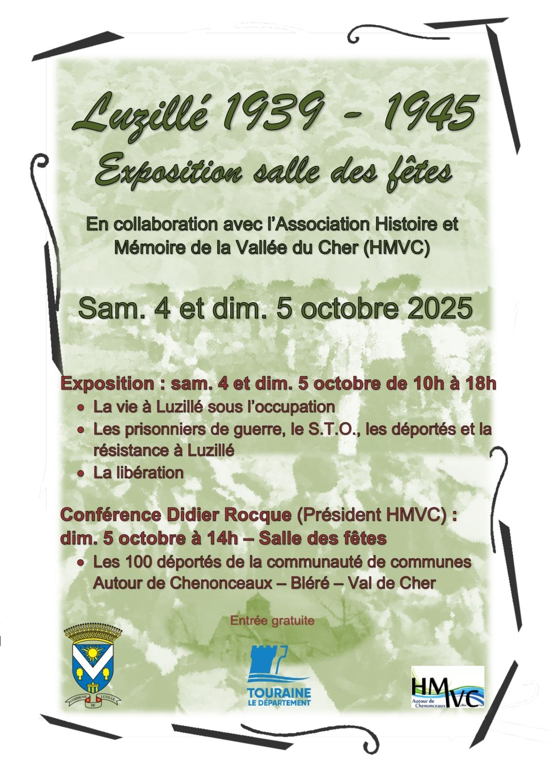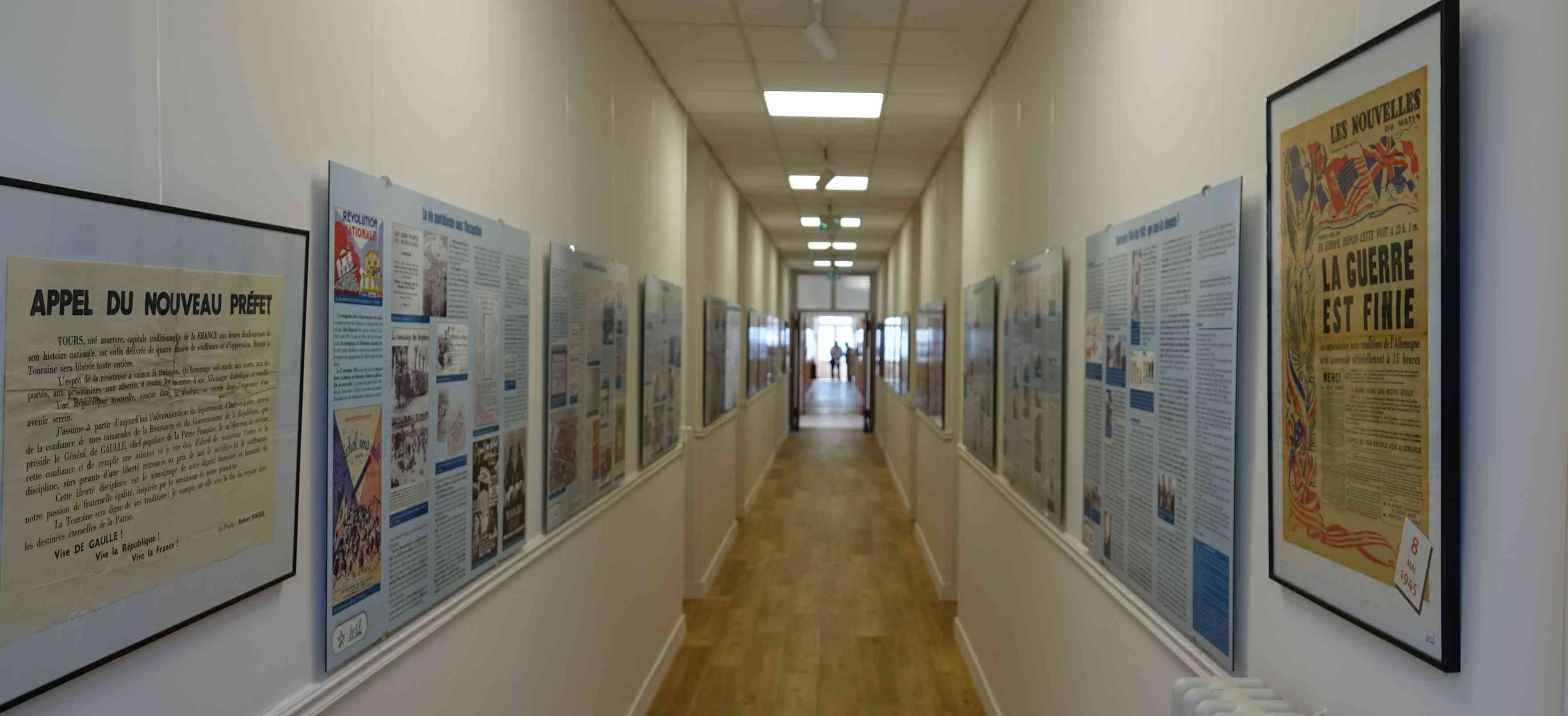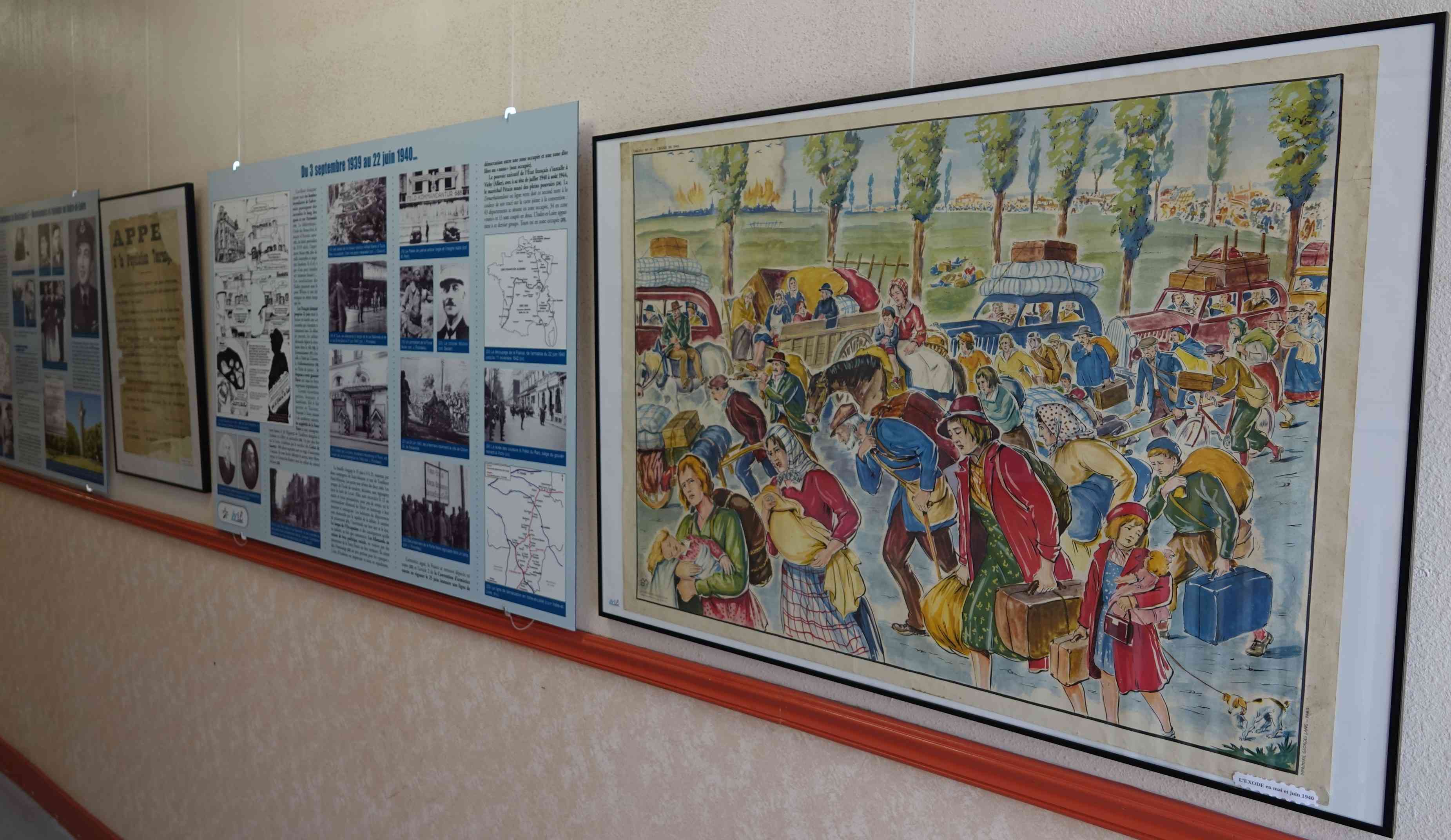 membre du comité scientifique pour la partie Résistance. Les panneaux ont été mis en place les 5, 12 et 16 juin par Chantal Ciret, Bernard Petit, Didier Rocque et Daniel Teillay. L'espace muséal comprend pour le moment : deux pièces aménagées comportant des objets, des drapeaux, des documents papier, des mannequins illustrant la Seconde Guerre mondiale et l'Armée de l'Air depuis 1945. Deux panneaux narrant la vie du Commandant Tulasne qui a donné son nom à la BA 705, réalisés par Chantal Ciret, figurent dans une de ces pièces. Tulasne a rejoint les Forces françaises aériennes libres au Moyen- Orient puis a participé à une des escadrilles baptisées Normandie-Niemen. Il a été abattu à Orel en URSS en 1943 et fait Compagnon de la Libération. Un drapeau FFI d'époque donné par l'ÉRIl et deux répliques de poteaux de la ligne de démarcation venant de l'association HMVC ornent aussi cette pièce. Le couloir faisant toute la longueur du bâtiment est recouvert des deux côtés par les 41 panneaux réalisés par Chantal Ciret sur l'histoire de la Touraine de 1939 à 1945. Ces panneaux d'1,20m sur 0,80m couvrent l'Occupation, la Résistance, la collaboration, la Libération, les exactions, l'épuration... Une douzaine de documents originaux mis sous cadre complètent cette exposition bien structurée donc convenant à un musée. Une fresque orne, à l'extérieur, le bâtiment. Elle met en relief l'Armée de l'Air et la Résistance. |